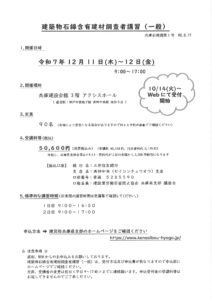 建設業労働災害防止協会 兵庫支部より建築物石綿含有建材調査者講習(一般調査者講習)のご案内がございます。 日時:令和7年12月11日(木)~12月12日(金)9:00~17:00場所:兵庫建設会館 アクシスホール(3階) […]
